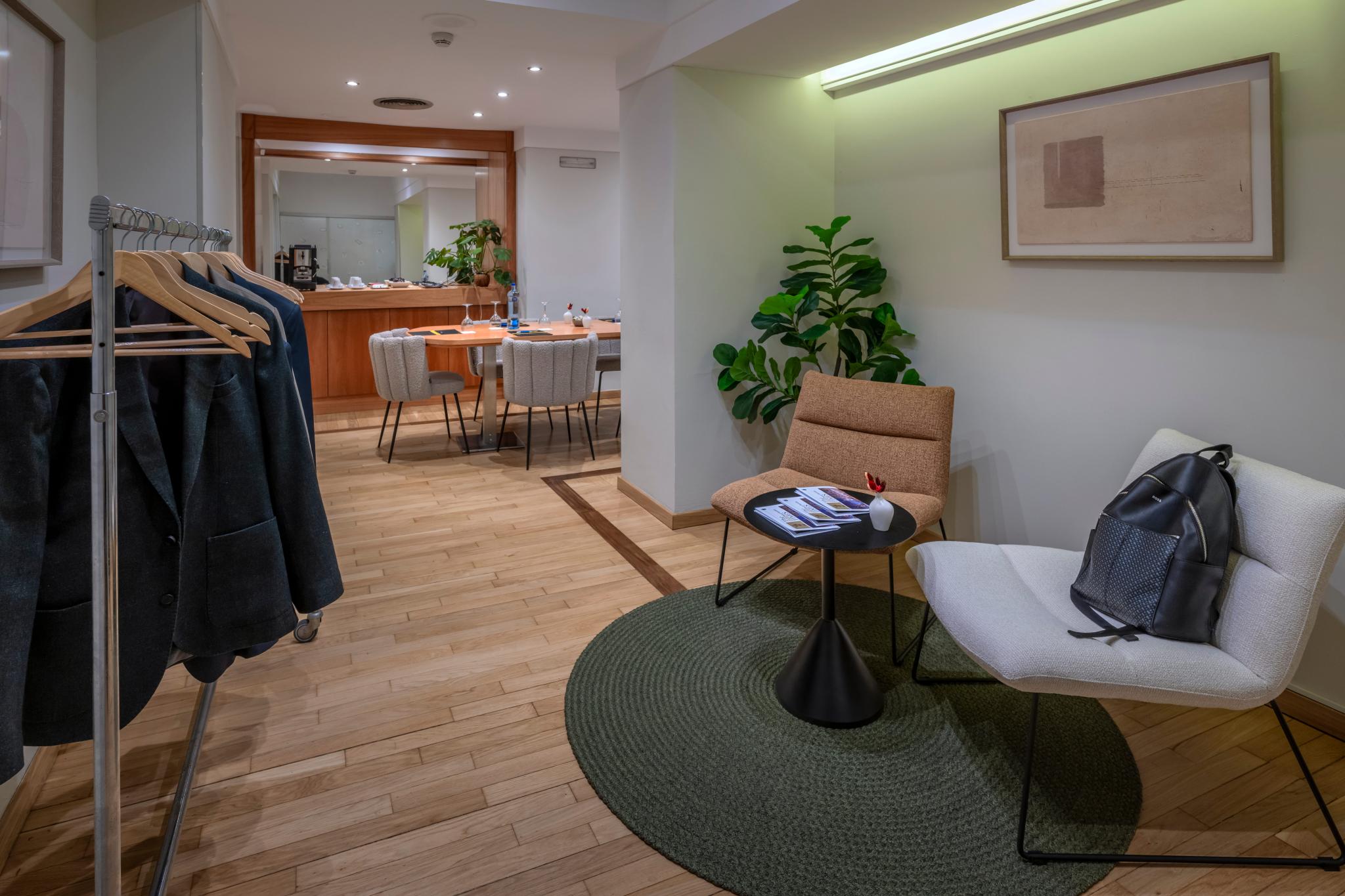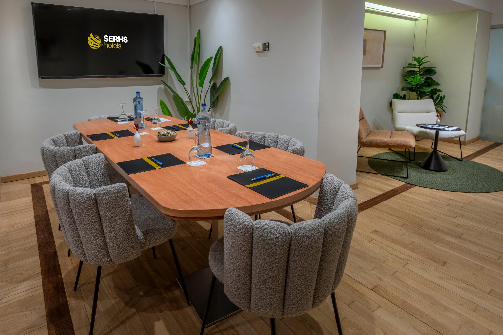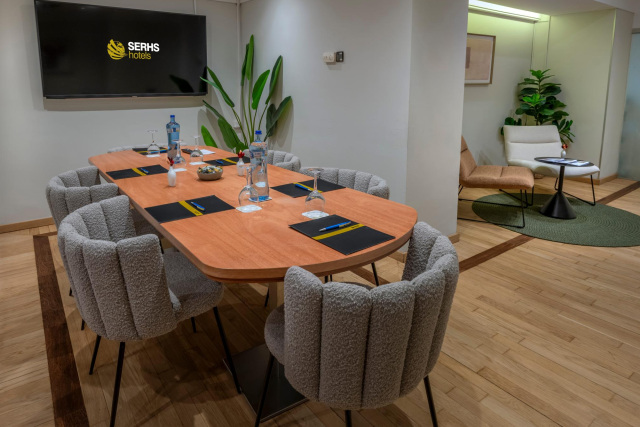 Solicitar Información SERHS Un salón íntimo en forma de L que destaca por su privacidad y ambiente acogedor. Dispone de un pequeño hall con butacas que aporta un toque más cercano y funcional, ideal para pausas o recepciones antes de la reunión.